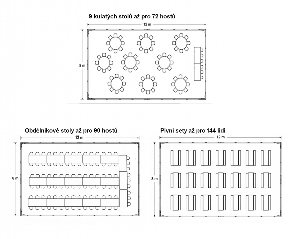 - Klasické sezení (pivní sety): 100 až 140 osob.